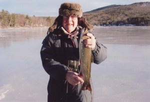 Bob Dam of Lewiston caught this 18½- inch brook trout at Worthley Pond in Peru on Jan. 23. Dam caught the fish, which was approximately 3½ pounds, while jigging with a worm. Dam said that it’s the biggest brook trout that he’s ever caught, and he has been fishing in the Allagash for 50 years.