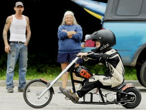 With “Team Wright” tattooed on his left arm, Mike Wright proudly watches his only child motor around an empty parking lot. Team Wright refers to “me and him,” he said, indicating the 7-year-old boy wearing Pikachu socks while driving his flame-covered chopper.