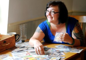 Michelle Morgan, 30, talks about the postcards dating from around 1900 she started collecting after finding them at Orphan Annie’s in Auburn. Now she has hundreds and even wrote a 300-page master’s thesis at the University of Southern Maine on the visual representation of women in that era.