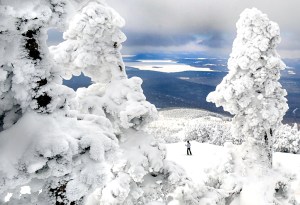 Skiers and snowboarders pose for photos, relax and enjoy the view and take in the spetactular view at the top of Saddleback as others head toward the trails in this file photo from this past winter.