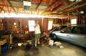 With a garage torn open and hundreds of trees lying on the ground, Peter Bickford was laughing Saturday night. “It looks just like a war zone out here.” Tired from cleaning up all day and daunted by the work ahead, he said it was all he could do.