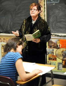 AUBURN — A few weeks before Christmas, teacher Carlene Magno stood before her English class dressed in Victorian garb: a black shawl, long skirt and cameo brooch. She read about Ebenezer Scrooge in the cemetery with the phantom, who was pointing to a grave.