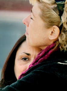 Kim Teehan, left, is hugged by her best friend, Kathy Landry, as Teehan’s home burns on Sylvan Avenue in Lewiston on Wednesday.