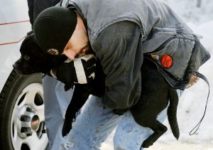 Jimmy Teehan hugs his dog Carlos after firefighters led the dog out of the burning house at 43 Sylvan Ave. in Lewiston on Wednesday morning. Carlos and Teehan’s cat Little Jabroni made it out safely, but Big Papi the cat and another dog died in the fire.
