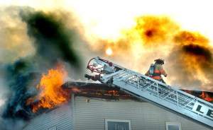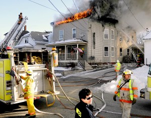 A firefighter works from a ladder truck to extinguish flames at a home at 43 Sylvan Ave. in Lewiston on Wednesday morning.