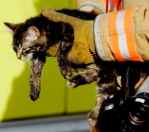 Jabroni the cat is carried out of the burning house on Sylvan Avenue by a Lewiston firefighter on Wednesday. Jabroni and a dog, Carlos, made it out safely. But Big Papi the cat and William the dog died in the fire.