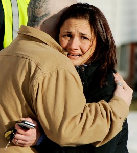 Tony Collins hugs Kim Teehan as Teehan’s home burns at 43 Sylvan Ave. in Lewiston on Wednesday morning.