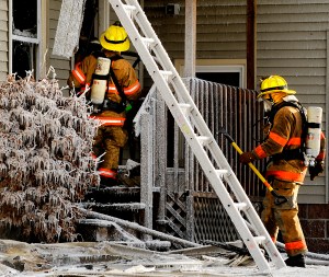 Firefighters contend with icy conditions during a fire at 43 Sylvan Ave. in Lewiston on Wednesday morning.