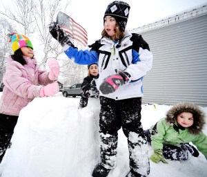 Jessica Roy, 11, center, gets some help from her neighbor, Amber Veilleux, 8, putting a flag on their snow fort in Roy’s front yard on East Avenue in Lewiston on Friday afternoon. Helping out are two of Jessica’s other friends and neighbors, Briana Coady, 8, right, and Alexis Paradis, 11, background center. They used a 5 gallon bucket to pack snow into bricks for the walls. They were having limited success with the method, but had great fun enjoying the mild temperatures and snow.