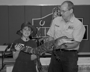 Wildlife Encounters Zoo, a New Hampshire-based nonprofit educational entity, visited the Minot Consolidated School on April 7 for in-school assemblies and to participate in an after school Family Science Night. The Minot Community Club sponsored the event. During the Family Science Night, students and families attended presentations featuring a wallaby, an African serval cat, an albino Burmese python and several other animals. “Zookeeper of the Day” Aaron Paradis, left, is pictured holding an American alligator with Wildlife Encounters Zoo founder and director, Derek Small.