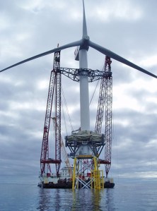 Here the German wind-energy company, REpower, installs a 5 megawatt turbine in the North Sea, 22 kilometers (13.6 miles) off the coast of Scotland in 45 meters (147 feet) of water.