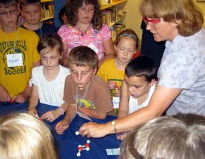 Hebron Academy science teacher Cindy Reedy of Norway demonstrated the formation of water molecules to participants in the Norway Memorial Library’s summer reading program. Reedy engaged children in a number of hands-on chemistry activities. Looking on, from left, are Dylan Cobbett of Norway, Ian Gilleland of Norway and Virginia, Frances Boutilier of Norway, Jillian Douglas of Norway, Kyle Grigg of Bridgton, Rhiana Stygles of Oxford and Noah Hall of Norway.