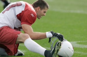Arizona Cardinals’ Sean Morey does some extra stretching between passing drills during football practice at the team’s training facility Thursday, Jan. 22, 2009, in Tempe, Ariz. The Cardinals face the Pittsburgh Steelers in Super Bowl XLIII on Feb. 1, in Tampa. (AP Photo/Ross D. Franklin)