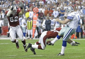 Dallas Cowboys’ Mat McBriar (1) has his punt blocked by Arizona Cardinals’ Sean Morey as Monty Beisel (52) looks on during overtime of an NFL football game Sunday, Oct. 12, 2008 in Glendale, Ariz. Beisel picked up the block and scored the game-winning touchdown to defeat the Cowboys 30-24. (AP Photo/Paul Connors)