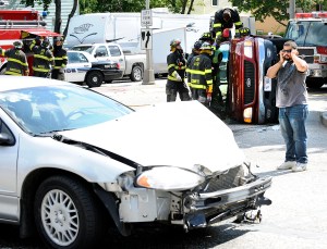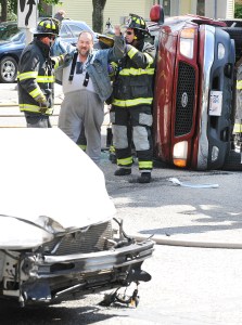 Robert Cyr of Greene raises his arms in celebration of “being alive” after he was extricated from his pickup Friday afternoon at the corner of Union and Hampshire streets in Auburn. He was traveling down the Union Street bypass when the light turned red. When he stepped on the brake, it slipped off and hit the gas, speeding through the intersection and colliding with a vehicle, foreground, driven by Jeremy Bright of Auburn, who was coming through the intersection after the light on his side turned green. “I just got my truck back from the garage yesterday after having $1,200 of bodywork done. But I am OK because I had my seat belt on,” Cyr said.