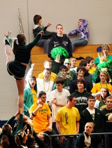 With the support of some of her fellow cheerleaders, Jessica Gauthier, top, gets the Oxford Hills fans pumped up before the start of Friday night’s varsity girls basketball game against Cony.