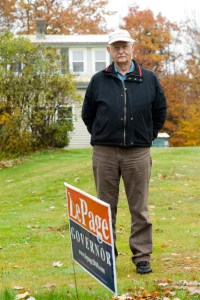 The entrance to his driveway on Greenwood Road is flanked by lawn signs for Republican candidates, including LePage and legislative candidates Tom Winsor and H. Sawin Millett Jr.
