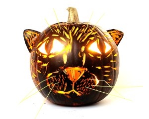 Tell us about what you did to your pumpkin: I tried to model my pumpkin after our spook-kitten, Polliwog. I painted the pumpkin with black acrylic paint before I carved it in the traditional fashion — kitchen knife, spoon, bowl, pumpkin goo, etc. Then I used wood carving tools to carve out the texture lines and details of the face. The whiskers are off of our broom. It was a really messy process — pumpkins are very moist, so the acrylic paint wouldn’t dry properly. I prefer to work in paper mache, though the toasted pumpkin seeds I got out of the process were yummy!