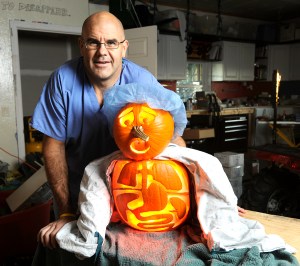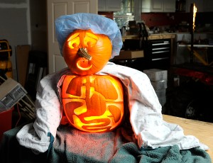 Tell us about what you did to your pumpkin: In keeping with the theme of creating a pumpkin carving related to my profession, as well as the fun spirit of the Halloween holiday (one of my favorites), I got the idea of using a multiple pumpkin design to have some fun with anatomy. I’m no great artist, but I sketched a simple and hopefully recognizable anatomic design onto our unfortunate pumpkin patient.