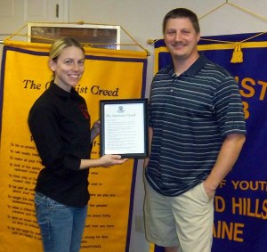 Jason Cyr, owner of Don’s Redemption Center in Norway, was the guest speaker at the Oxford Hills Optimist Club’s October meeting. Cyr spoke about being Cub Master of the Cub Scouts in South Paris and the importance of helping parents become more involved with their children and their activities. He also spoke about the ongoing bottle drives at Don’s Redemption that benefit various youth groups in the area. Cyr, right, is pictured receiving a framed copy of the Optimist Creed from club President Sandi Wyman.