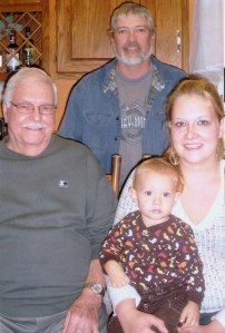Four generations were present at a recent birthday celebration. In front from left are Raymond Allen of Lewiston, great-grandfather, and mother, Kayla Allen of Farmington, holding her son, AlexHutchins, age 15 months; back, John Allen of Canton, grandfather.