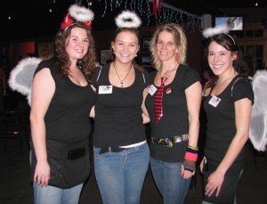 Sporting halos and angel wings and/or devil’s horns for Saturday’s debut Back In Time Party are Foggy Goggle waitress Jenny Tibbetts, left, hostesses Jasmine Jacques and Linda Mason, and waitress Brittany Buckley at Sunday River Ski Resort’s first Winterfest weekend in Newry. The event was to showcase guests “dressed to impress” in their best 1970s and ’80s attire. As of 4:30 p.m., the Sugar and Spice set and a bartender dressed as an elf were the only outfits in sight as Time Pilots performed on stage.