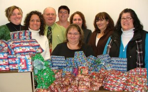 Rainbow Federal Credit Union of Lewiston-Auburn adopted four families for Christmas in the Androscoggin and Oxford county areas this year. With the help of two local organizations, Rainbow received four families and a list of items that the families needed. Employees got the lists and went shopping. From left are Laurie Pelletier, Kim Sands, Tom Stretton, Danita Mathieu, Wanda Charest, Denise Gauthier, Linda Porter and Debra Conrad.
