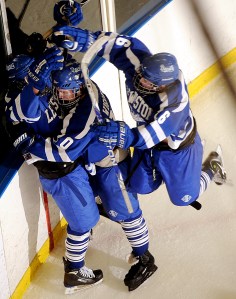 With revenge in the back of their minds from last season’s early exit from the playoffs, and perhaps amped up by the larger-than-normal crowd, the senior-laden Blue Devils dominated all but about a minute of the first of two regular-season meetings with St. Dom’s, earning a 5-2 victory over the Saints at the Androscoggin Bank Colisee.
