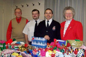 Auburn’s Danville Junction Grange members donated toys, books and games to the Salvation Army recently. From left are Community Service Co-Chairman Franklin McAlister, Bandmaster Michael DeMatto, Lt. Jason Brake and Community Service Co-Chairwoman Joyce MacDonald. Brake and DeMatto played several musical numbers for the members.