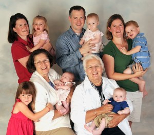 Four generations of a Lewiston family got together recently. In front from left are Hannah Cook, great-granddaughter, of Saco; Wanda Brown, daughter, of Auburn, holding Meghan Ackley, great-granddaughter, of Lewiston; and Jeanne Hood, great-grandmother, of Lewiston, holding William Ackley, great-grandson), of Lewiston; back, Valerie Ackley, granddaughter, holding Katherine Ackley, great-granddaughter, of Lewiston; Tom Brown, grandson, holding Ally Brown, great-granddaughter, of Oceanside, Calif.; and Carolyn Cook, granddaughter, holding Austin Cook, great-grandson, ofSaco.