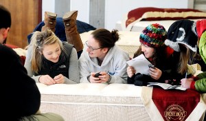 Lexi Clavet, left, Jen Rioux and Hannah Fournier chat during a slow period of the Edward Little High School Ski Team Mattress Fundraiser at Auburn Middle School on Saturday. Faced with the need to raise $3,000 to compete in the Class A State Meet in Mars Hill in February, the 23-member ski team and Custom Fundraising Solutions teamed up to raise the money. “Skiing is expensive,” said head coach Tara Eretzian, explaining that the team would have to stay three nights in Presque Isle during the state championship meet. Aside from the Auburn Ski Association, the ski team is self-supporting, Eretzian said. The ski team sold 14 mattresses as of 12:30 p.m. Victoria Bunker fills out paperwork at right.