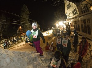 Snowboard Riders climb the hill at the start of the second annual Bethel Rail Jam during a highlight of the town’s WinterFest. Skiers and riders from all over New England came to compete in the event which involved trucking snow and building a park on Main Street. Bethel Maine’s Winterfest concludes this weekends with a full Moon hike up Mt Abram, Helicopter rides and a children’s musical.
