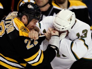 Stars agitator Steve Ott bloodied Boston’s Gregory Campbell one second after the puck was dropped. That was followed by Boston’s Shawn Thornton pounding Stars forward Krys Barch one second later. And then Boston’s Adam McQuaid was fighting Dallas’ Brian Sutherby 4 seconds in as the crowd roared with approval.