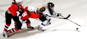 Marisa Zamrock poked a rebound past Stanley 4:01 into the third to put the Saints in front by a goal on a rebound on the power play, and she added another on a feed from Anna Desjardin at 10:40 to seal the deal.