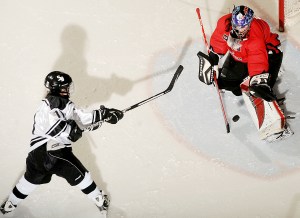 The Red Hornets then wowed those in attendance by scoring the game’s first goal — on a draw play in the St. Dom’s zone on a rare 4-on-3 power play. Kayla Royer won the faceoff to Shelbea Russell, who fired the puck past Keaney to put Leavitt/EL on top 1-0.