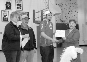 Faculty nominated several members of the senior class for a DAR award at Dirigo High School in Dixfield. Class members voted for their choice, Justin Richards, to receive the Daughters of the American Revolution Award. Joanne Page and Deborah Judkins from the local DAR chapter addressed the student body to explain a little about their organization and present the award. From left are Justin’s parents, Darlene and Bill Richards, Justin and Deborah Judkins.