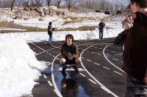 Edward Little High School students Matt Thomas, left, and Brian Crane, right, toss a baseball on the school track Tuesday afternoon. Thomas and Crane said they were enjoying the sun and loosening up with a baseball before tryouts in April.