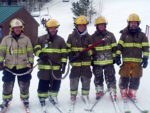 The Harrison Fire Department’s annual ski race, “Mary’s Firemen for a Cure,” was held at Shawnee Peak recently. The department collected donations for the Susan G.Komen Breast Cancer Foundation and raced down the ski course in full turn-out gear, carrying a 50-foot hose. Racing to try to get the fastest time, Henry Hudson led the team, saying “tuck it down boys,” and they took first place. From left are Jeffrey Murphy, Michael Sampson, Henry Hudson, Bob Bissonnette and George Menezes.