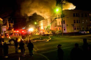 Firefighters from Lewiston, Auburn and Lisbon battled the blaze in the building which formerly housed the Champoux Insurance Agency.
