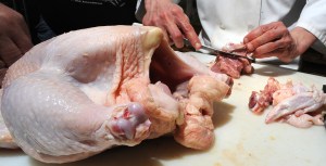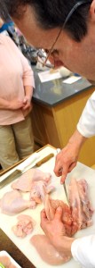 First things first: Liudvinaitis demonstrated how to prepare and cut up a whole chicken, something I’ve never done. The biggest key to easy chicken preparation, it appears, is the knife! He said your knife should be very thin and very sharp, which he demonstrated with his boning knife. “Don’t use a chef’s knife,” he said, “because it will be too bulky. You need to make sure you have control over it.”