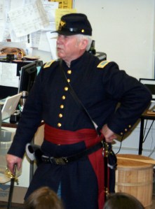 Paul Dudley, president and reenactor of the 20th Maine Regiment Volunteer Infantry, Company B, visited 8th graders at Lewiston Middle School as part of their Civil War Study. Throughout his day-long visit, students learned about camp life, music, recruitments and weaponry. The event was organized by Sue Reny and Karla Good.