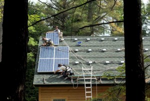 All it will take to start is a flip of the switch, said Josh Baston, project manager with ReVision Energy of Portland whose crew is installing 5- by 3-foot solar panels over portions of the 776-square-foot Lakeside Lodge roof this week. Most are being installed on the south side of the building for maximum sunlight.