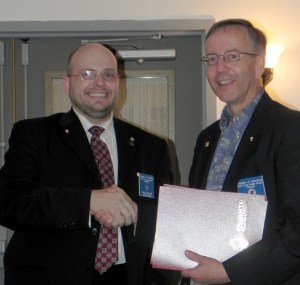 The Holy Cross Knights of Columbus Council 12,652 held their end of the year banquet on May 21 at the Carriage House in Lewiston. The following awards were awarded for Knight of the Year and for Family of the Year. In the top photo, Grand Knight Daniel Leclair, at left, presents the Knight of the Year award to Laurier Thibault. Bottom photo, Leclair presents the Family of the Year Award to Claude Mailhot, left, and Denise Mailhot.