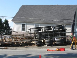 The 2011 Peterbilt truck and trailer owned by D.A.N. Express of Quebec was heavily damaged and was impounded for further inspection.