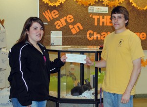 Ashley Harvey of Hebron, left, presented Zachary Black, operations manager at the Greater Androscoggin Humane Society, with a $200 donation recently. A student at Oxford Hills Comprehensive High School, Harvey was required to complete a senior project to benefit a nonprofit. The shelter is located at 55 Strawberry Ave., Lewiston. For more information, call 783-2311 or visit www.gahumane.org.