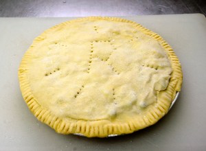 The Bubiers have been raising meat rabbits for their own consumption since the 1970s, but commercially for about two years. He now has 150 meat rabbits on his farm on Merrill Hill Road in Greene, and is often in the thick of producing rabbit pot pies — he estimates he sells at least 30 pies a week. Since his business is constantly growing, he now buys rabbits from other growers; otherwise he figures he would need at least 1,000 rabbits to keep up with demand. His farm and commercial kitchen are both inspected and licensed as a processing facility. He has begun to both wholesale to other farm market vendors and supply restaurants.