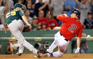 Boston grabbed a 1-0 lead in the first on Adrian Gonzalez’s RBI single before Oakland took the lead with two in the second, coming on RBI singles by David DeJesus and Pennington.<