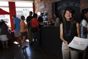 Laskey met the group, talked some about Portland’s food scene and about Vervacious, before turning the floor over to store co-owner Heidi Stanvick. Stanvick talked about the various goodies in the store, as Laskey brought out samples, from lobster on crackers to blueberries in a yogurt, paired with a perfect wine. There were appreciative murmurs as the tour-takers sampled the goods, and then browsed the store.