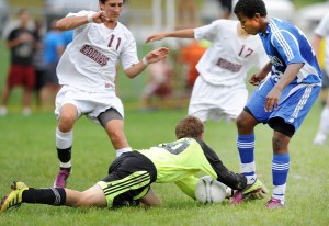 Despite standing water on the sideline and long grass that helped to slow down Lewiston, the Blue Devils still held a huge edge in shots, 27-5. But the overwhelming majority of those shots came from outside the box, including Benji Abdisalan Saban’s goal that put Lewiston ahead 8:50 into the second half.