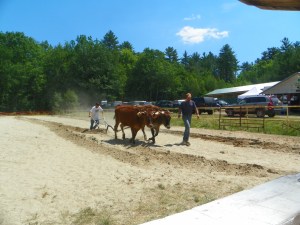 With the temperature at about 90 degrees, Matt Barker of Harrison and Scott Wheelis of Bowden gave a demonstration at Waterford World’s Fair showing how farming was done many years ago. The team of oxen were a cross breed of Holstein and Brown Swiss. They weighed 1750 pounds combined and were about 3 1/2 years old. Wayne Millakin of Poland provided two pieces of equipment that he refurbished, a walker plow and a spring tooth harrow which performed as if they were new. A small crowd stood and watched the men and the oxen and one gentleman was heard saying he remembered using those kinds of farming equipment when he was younger and he was glad he did not have to use them that day as hot as it was.